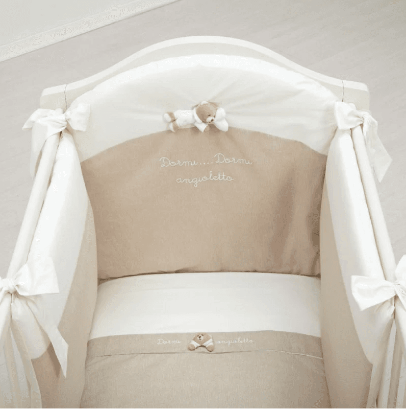 Il set piumone Nanán della nuova collezione Tato è formato da: federa per cuscino, paracolpi imbottito, piumone sfoderabile e quindi facile al lavaggio, con una composizione di puro cotone chambre. Impreziosito dal ricamo centrale delle frasi, dalle applicazioni del tenero orsetto Tato e dal gioco di colori formato dall'alternarsi del panna e del tortora. Un lettino giocoso e romantico, per far sentire protetto il bebè durante la nanna assieme al suo piccolo amico Tato.